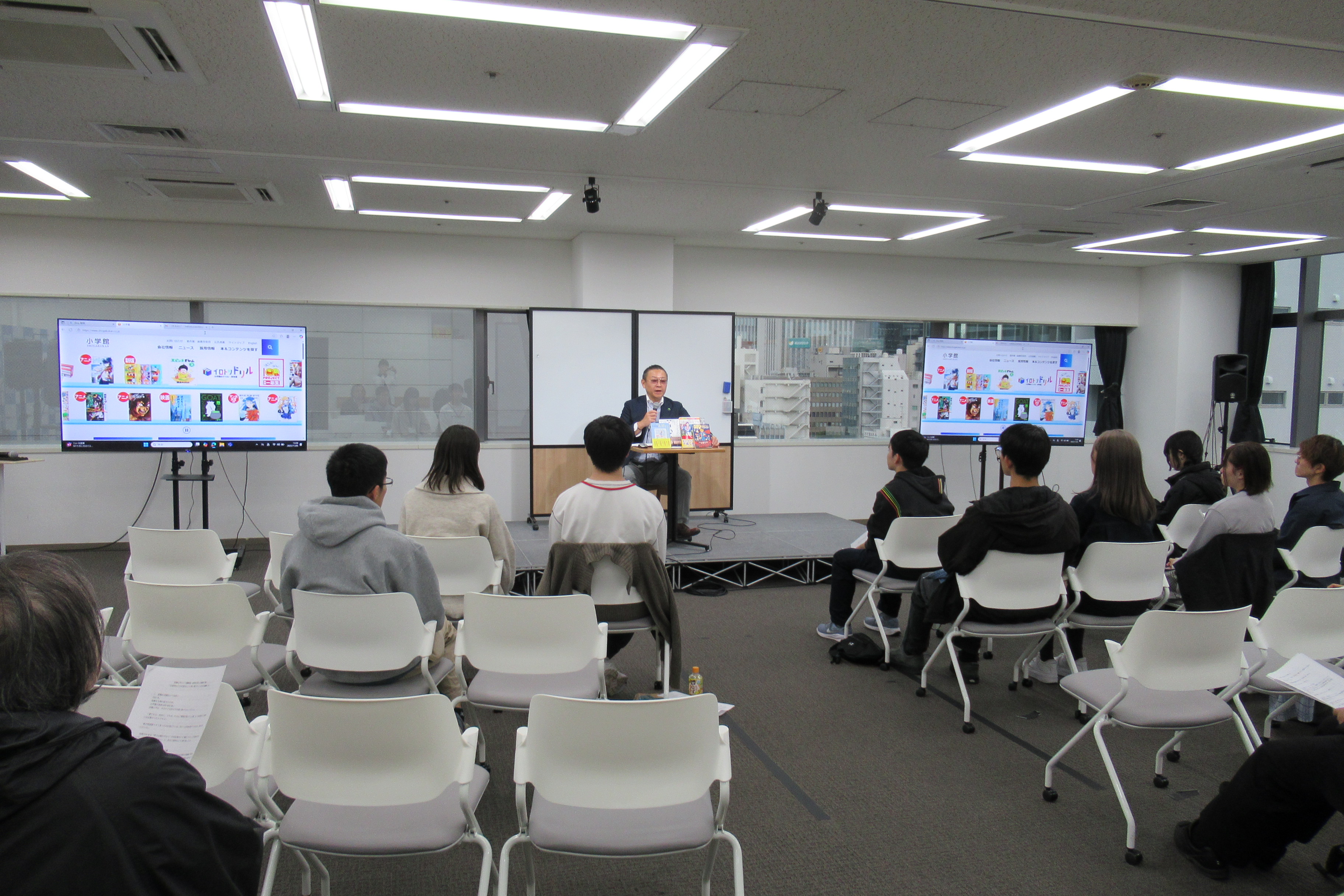 選書ツアーが終わると、小学館の編集者※を招いて講演会を行いました。編集者ならでは出版の裏側はもちろん、どうして編集者になろうと思ったのか等、様々な話を聴くことができ、本当に素敵な時間となりました。