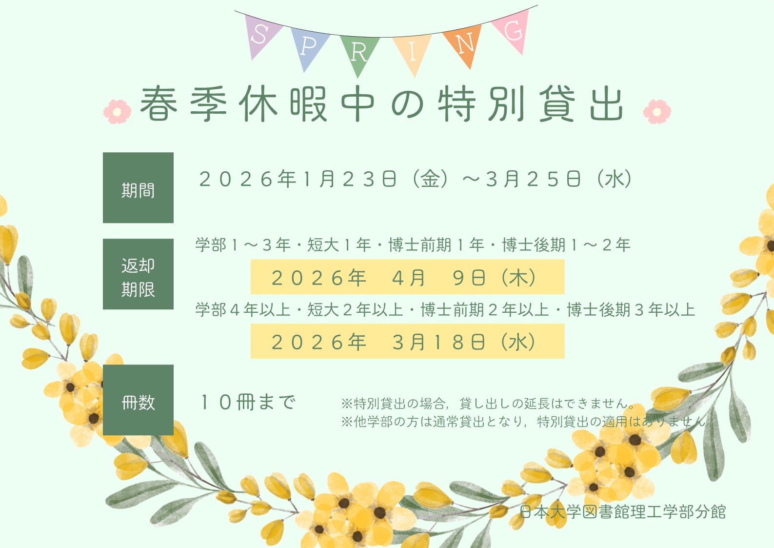 春季休暇中の特別貸出について,次のとおり実施いたします。